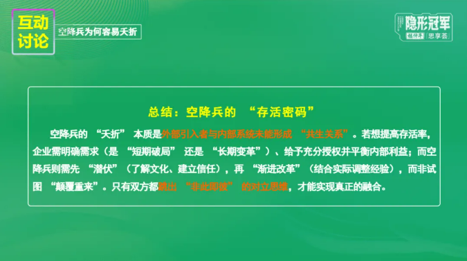 他還分析了“內(nèi)部選拔”與“外部招聘”的優(yōu)劣勢及適用場景,強調(diào)企業(yè)應(yīng)基于發(fā)展階段靈活選用策略。針對“空降兵”這一典型現(xiàn)象,李老師指出成功的關(guān)鍵在于立“共生關(guān)系”:前三個月應(yīng)多觀察、少主導,以技術(shù)專長協(xié)助其他部門,逐步建立信任、推動變革,最終實現(xiàn)團隊融合。