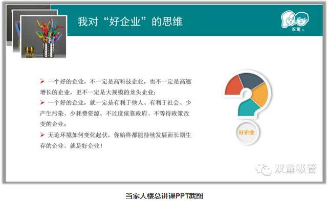 當(dāng)家人樓總答:大家總認(rèn)為大的發(fā)展快的企業(yè)才是好企業(yè)。其實(shí)企業(yè)要活著,持續(xù)的產(chǎn)出產(chǎn)品,并且產(chǎn)品越做越好才是一個(gè)好企業(yè),好的企業(yè)是不斷滿足消費(fèi)者需求的企業(yè)!