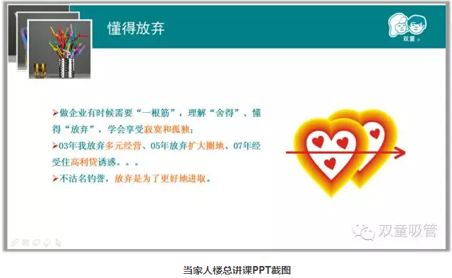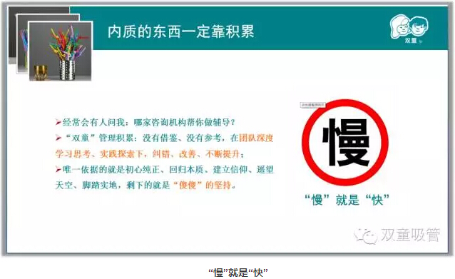 在全球經(jīng)濟形勢并不樂觀的大背景下 ,不少企業(yè)遭遇著生存困境,有的甚至面臨倒閉。吸管妞研究后發(fā)現(xiàn),大部分陷入困境的企業(yè)都有一個共同點,就是擴張速度過快或者過度多元化。而在“雙童”發(fā)展過程中,當家人樓總一直倡導做企業(yè)要“慢”,不可貪大求全,更不能為了尋求快速發(fā)展而投機取巧。當家人樓總經(jīng)常說,在一定程度上其實“慢”就是“快”!今天吸管妞就和大家一起來理解這個觀點!