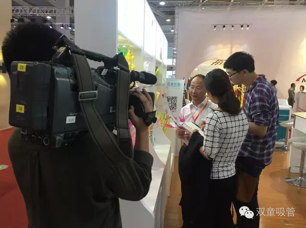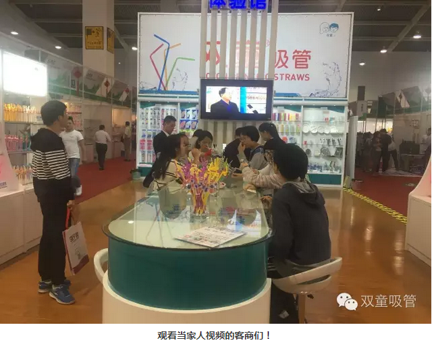 經(jīng)過雙童經(jīng)過的客商基本都會留下腳步。原來是雙童展位的正中央掛著一臺大尺寸的電視機,不間斷的滾動播放當家人接受的各類節(jié)目采訪,以及各類媒體對雙童吸管進行報道的視頻!看來咱們當家人的魅力還真是大呀!