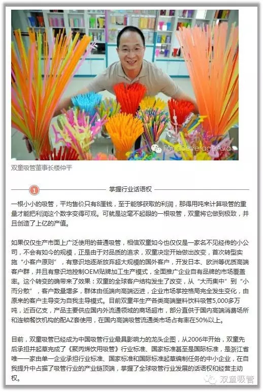 目前,雙童吸管已經(jīng)成為中國吸管行業(yè)最具影響力的龍頭企業(yè),從2006年開始,“雙童”先后承擔(dān)并起草完成了《聚丙烯飲用吸管》行業(yè)標(biāo)準(zhǔn)、國家標(biāo)準(zhǔn)甚至是國際標(biāo)準(zhǔn),是浙江省唯一一家由單一企業(yè)承擔(dān)行業(yè)標(biāo)準(zhǔn)、國家標(biāo)準(zhǔn)和國際標(biāo)準(zhǔn)起草編制任務(wù)的中小企業(yè),在自我提升中占據(jù)了吸管行業(yè)的產(chǎn)業(yè)鏈頂端,掌握了全球吸管行業(yè)發(fā)展的話語權(quán)和經(jīng)營主動(dòng)權(quán)。