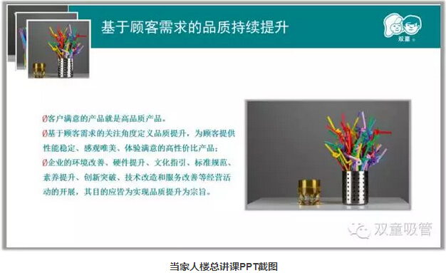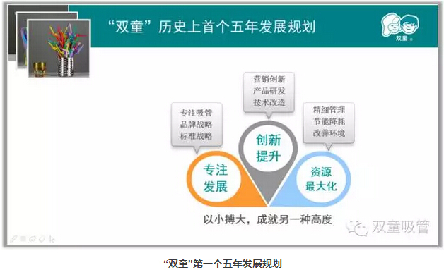 首先,當(dāng)家人樓總對(duì)“雙童”過(guò)去的五年發(fā)展規(guī)劃,及“雙童”發(fā)展前后十年進(jìn)行了對(duì)比與總結(jié)。2005年,“雙童”提出了第一個(gè)五年發(fā)展規(guī)劃,其中提到了三個(gè)關(guān)鍵詞“專注發(fā)展”、“創(chuàng)新提升”、“資源最大化”,在這期間,“雙童”始終堅(jiān)持以小博大的理念,沒(méi)有貪大求全,急功近利,專注做好一根吸管。