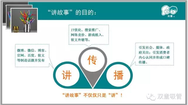課程開始,吸管妞也從“雙童”是如何做自媒體傳播的故事開始講起。沒想到,原來“雙童”的文化傳播還分為好幾個階段,從硬廣時期,到后來的塑造差異化亮點,引導媒體給“雙童”講故事,再到成立文宣部門,形成團隊“講故事”,最后達到形成企業(yè)文化,形成口碑傳播。“雙童”之所以有今天的文化影響力,與當家人樓總的遠見卓識是密不可分的!