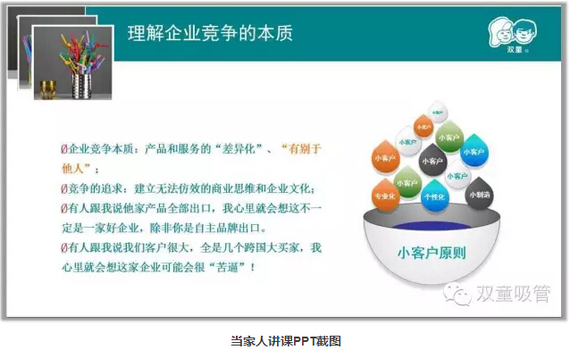 最關(guān)鍵的一點(diǎn)是,這些小客戶促發(fā)了“雙童”的產(chǎn)品創(chuàng)新?,F(xiàn)在,大量中小商超、咖啡館、會(huì)所、酒吧、KTV成為“雙童”的客戶,“雙童”的客戶群體從2003年的幾十家變成了現(xiàn)在的幾萬(wàn)家。這些客戶對(duì)產(chǎn)品的要求各不一樣,從某種意義上說(shuō),從“雙童”制定小客戶原則時(shí),事實(shí)上就開始了如今才在制造業(yè)流行的“個(gè)性化、小批量、定制生產(chǎn)”了。