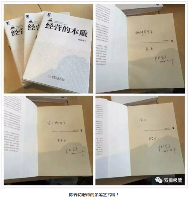百聞不如一見,吸管妞今兒可算見到真人啦,內(nèi)心十分激動呢,趕緊拿出事先準備好的陳老師的大作《經(jīng)營的本質(zhì)》請她請簽名。當家人樓總也化身為小粉絲,簽完名后陳老師和當家人樓總進行了簡單的交流。