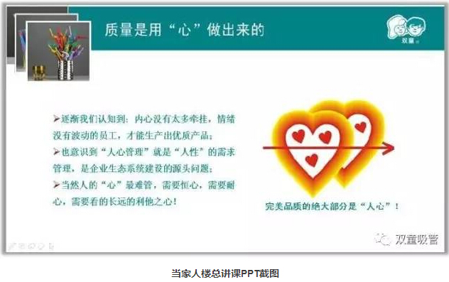 “雙童”逐漸認(rèn)知到:“家”是員工最大的牽掛,只有改變員工才能改變產(chǎn)品從而改變企業(yè)。“人心”最難管,員工沒有了牽掛,才能全身心投入到工作當(dāng)中,才能做出更加完美精細(xì)的產(chǎn)品,人心管理就是企業(yè)生態(tài)系統(tǒng)的改善。從2005年9月開始,“雙童”明確把“家文化”作為員工管理的著力點(diǎn),以“小家”形成“大家”,凝聚團(tuán)隊(duì)“人心”!