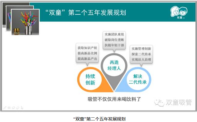 “雙童”公司是我1994年建立的,已經(jīng)22載。2011年,在頒布了公司下一個《企業(yè)五年發(fā)展規(guī)劃》的同時我提出“持續(xù)創(chuàng)新,再造經(jīng)理人,解決二代傳承”。