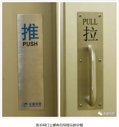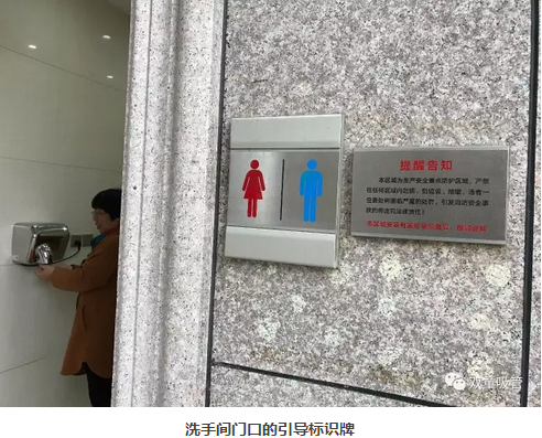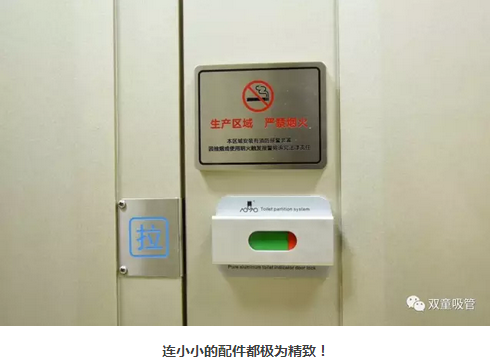 除此之外,衛(wèi)生間內(nèi)還有許多提示引導(dǎo)的標(biāo)示牌,每個配件都極為精致!每扇門上都會有“生產(chǎn)區(qū)域,嚴(yán)禁吸煙”的標(biāo)識,每個蹲位后面都有“便后請沖水、素養(yǎng)高低往往體現(xiàn)在關(guān)上門自己獨(dú)處之時”的溫馨提示,引導(dǎo)員工提升素質(zhì)。偷偷爆個料,所有標(biāo)識牌都是由當(dāng)家人樓總自己設(shè)計(jì)的呢!