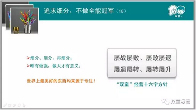其實(shí)真正把自己的產(chǎn)品做好了,企業(yè)在一定時(shí)候擴(kuò)大規(guī)模才是自然而至!“雙童”的發(fā)展始終伴隨著不斷地放棄,在自己的領(lǐng)域里細(xì)分細(xì)分再細(xì)分,把一根吸管做到極致!在利他的基礎(chǔ)上不斷堅(jiān)持,懂得放棄,關(guān)注事物本身,回歸商業(yè)本質(zhì)!