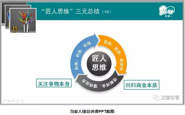 當(dāng)家人樓總圍繞“匠人思維”的商業(yè)本質(zhì)、“競(jìng)爭(zhēng)”的商業(yè)本質(zhì)兩方面進(jìn)行分享!首先當(dāng)家人樓總講述了他對(duì)“匠人思維”的理解,從本質(zhì)上來講“匠人”不只是為他人著想,更不是大公無私,而是基于理性、立足客觀、看的長(zhǎng)遠(yuǎn)。只有遵循商業(yè)本質(zhì),凡事長(zhǎng)遠(yuǎn)計(jì)議,以利他之心去經(jīng)營(yíng)才能把事業(yè)做好。同時(shí),當(dāng)家人樓總也和大家分享了“雙童”的發(fā)展也一直圍繞著“匠人之心”——“初心”、“恒心”、“平常心”。
