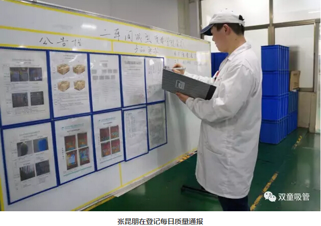 每天,張昆朋都要對(duì)產(chǎn)品進(jìn)行檢驗(yàn)。從核對(duì)訂單開始做起,檢查生產(chǎn)的產(chǎn)品是否符合訂單要求,同時(shí)對(duì)生產(chǎn)過程中的產(chǎn)品進(jìn)行檢驗(yàn),檢查管子是否有裂口,管子的長度、圓度、顏色等是否符合標(biāo)準(zhǔn),禁止不合格品流出車間!除此之外,產(chǎn)品有沒有出現(xiàn)多支或少支的情況,產(chǎn)品的包裝袋是否有臟物以及紙箱是否符合訂單要求都要進(jìn)行抽檢。抽檢結(jié)束后所檢產(chǎn)品要進(jìn)行數(shù)據(jù)記錄,并在車間質(zhì)量管理看板上登記每日質(zhì)量通報(bào),警醒員工們不要犯同樣的錯(cuò)誤!他說:“我要確保從我手上出去的吸管是世界上最好的吸管!”
