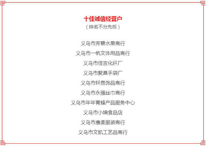 1月9日上午,義烏市2017年“誠(chéng)信日”暨“義烏中國(guó)小商品城”品牌授權(quán)儀式在幸福湖隆重舉行!為褒揚(yáng)守信主體、營(yíng)造誠(chéng)信氛圍,當(dāng)天還舉行了首屆守信“紅名單”發(fā)布儀式,為“十佳誠(chéng)信企業(yè)”、“十佳誠(chéng)信外商”、“十佳誠(chéng)信電商”和“十佳誠(chéng)信經(jīng)營(yíng)戶”授牌。“雙童”也名列其中,成為“十佳誠(chéng)信企業(yè)”之一!