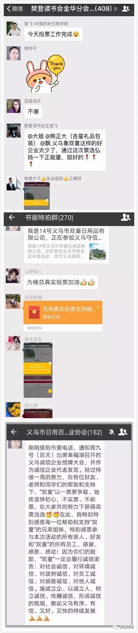 很多好友都積極幫“雙童”投票,吸管妞在此特別感恩每一位支持“雙童”的兄弟姐妹,感恩參與此次活動(dòng)的所有好友、粉絲和“雙童”的所有員工們!在此特別感謝樊登讀書會(huì)和書畫特拍群的好友們,每天都堅(jiān)持為“雙童”投票,除此之外,還引導(dǎo)自己朋友圈的好友們?yōu)?/span>“雙童”投票,感謝大家支持!