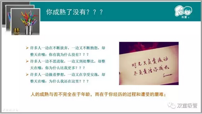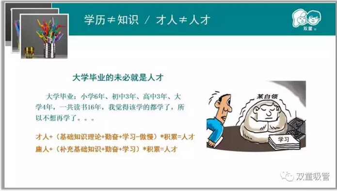 學(xué)歷≠知識、才人≠人才,樓總也鼓勵大家,一定要堅持學(xué)習(xí),學(xué)習(xí)并不是學(xué)校里才需要做的事!如果工作以后就不思進(jìn)取,不學(xué)習(xí)提升,就算是博士生,“雙童”也不會對你敞開大門!而對于那些肯學(xué)習(xí)、肯鉆研的員工,“雙童”會提供非常多的學(xué)習(xí)機(jī)會和提升空間,讓你在“雙童”有一個更好的發(fā)展!就算有一天你離開了“雙童”,你學(xué)到的始終是你自己的!