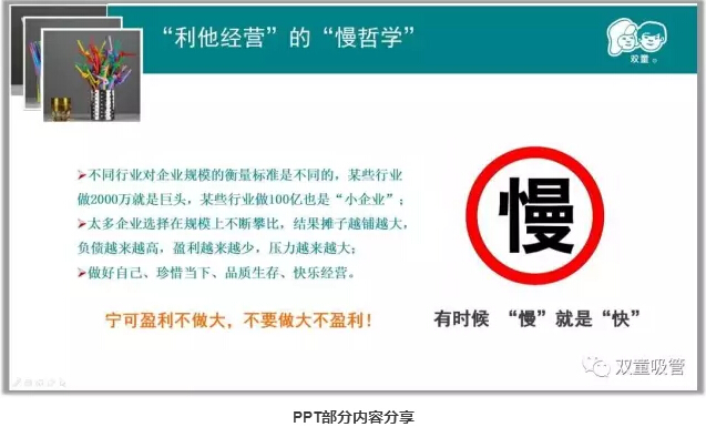 “利他經(jīng)營(yíng)”的慢哲學(xué):太多企業(yè)選擇在規(guī)模上不斷攀比,結(jié)果攤子越鋪越大,負(fù)債越來(lái)越高,盈利越來(lái)越少,壓力越來(lái)越大。其實(shí)“慢”的本質(zhì)是不犯錯(cuò)誤少走彎路,不斷積累,有時(shí)候“慢”就是“快”!