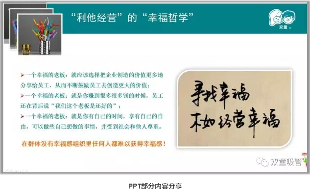 “利他經(jīng)營(yíng)”的“幸福哲學(xué)”:一個(gè)幸福的老板,就應(yīng)該選擇把企業(yè)創(chuàng)造的價(jià)值更多地分享給員工,從而不斷鼓勵(lì)員工去創(chuàng)造更大的價(jià)值,員工會(huì)說(shuō)這個(gè)老板好;一個(gè)幸福的老板:就是你有自己的時(shí)間,享有自己的自由,可以做些自己想做的事情,并受到社會(huì)和他人尊重!