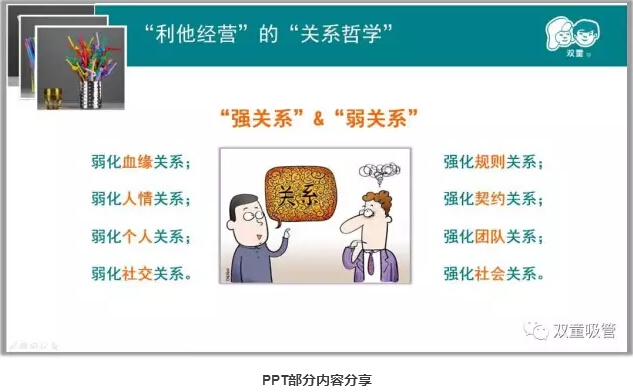 “利他經(jīng)營(yíng)”的“關(guān)系哲學(xué)”:企業(yè)如何通過(guò)引導(dǎo)讓關(guān)系達(dá)到最優(yōu)配置?“雙童”樓仲平十分注重關(guān)系哲學(xué),通過(guò)弱化血緣關(guān)系,強(qiáng)化規(guī)則關(guān)系;弱化人情關(guān)系,強(qiáng)化契約關(guān)系;弱化個(gè)人關(guān)系,強(qiáng)化團(tuán)隊(duì)關(guān)系;弱化社交關(guān)系,強(qiáng)化社會(huì)關(guān)系,從而為企業(yè)持續(xù)發(fā)展創(chuàng)造良好條件!