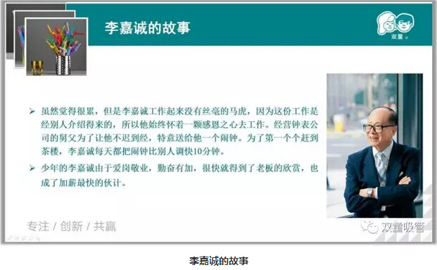 我們都應(yīng)該心懷感恩之心,用感恩的心去工作。妞也用李嘉誠的案例故事和童鞋們進行分享:“李嘉誠在茶樓當伙計時,每天天未亮就出去工作,盡管每天工作時間長達15小時,也不會絲毫的懈怠馬虎,始終懷著一顆感恩之心去工作。在隨后的創(chuàng)業(yè)過程中,懷著感恩之心開創(chuàng)了屬于自己的事業(yè),成為華人首富。”李嘉誠的事例說明,感恩和敬業(yè)可以最大程度的激發(fā)一個人的潛能,使之迅速在職場中脫穎而出,無論你從事什么工作,都要牢記,用心者事競成!