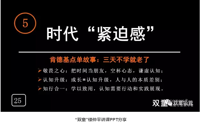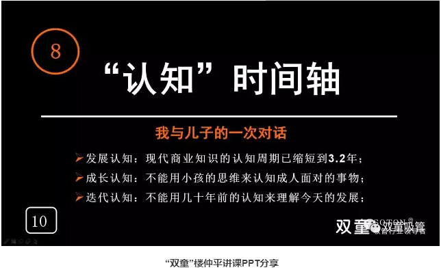 “認(rèn)知”時間軸:“雙童”樓仲平通過自己與兒子的一次對話認(rèn)知到不能用慣性思維來認(rèn)知我們的下一代。樓仲平的成長也伴隨著不斷的否定,在認(rèn)知、糾錯、不斷改變下實現(xiàn)自我成長。“創(chuàng)業(yè)者”最應(yīng)該有“時間軸”的概念,需要擁有自我蛻變的能力,否則你就很難成長!