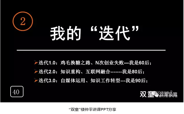 我的“迭代”:“雙童”樓仲平通過自身不斷的學(xué)習(xí):在浙大學(xué)習(xí)進(jìn)修、學(xué)習(xí)電腦設(shè)計,認(rèn)知到自媒體作用,與年輕人鏈接、培養(yǎng)團(tuán)隊,自己轉(zhuǎn)變教育工作……不斷否認(rèn)自我、重新認(rèn)知,實現(xiàn)迭代!