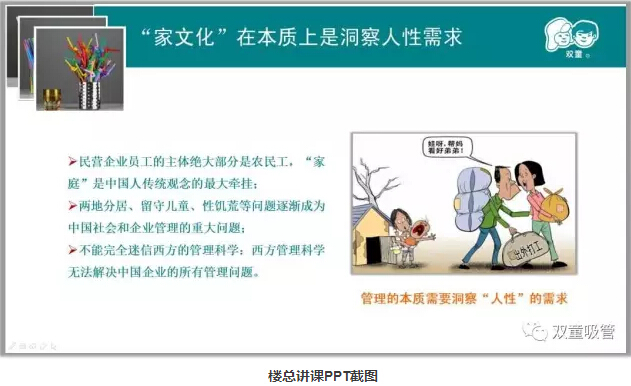 “雙童”樓仲平答:“雙童”之所以注重“家文化”,也是基于洞察人性的需求。從“人性”的角度來說,站在員工的角度進(jìn)行換位思考,給員工解決兩地分居、留守兒童、農(nóng)民工性饑荒等后顧之憂,員工一定會(huì)以更長(zhǎng)遠(yuǎn)的角度來看待自己的工作,來理解自己與企業(yè)之間的關(guān)系。