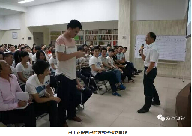在學(xué)習(xí)會(huì)開(kāi)場(chǎng)前,“雙童”樓仲平現(xiàn)場(chǎng)邀請(qǐng)了員工整理蘋(píng)果電腦充電線,結(jié)果員工認(rèn)真的繞了好幾次也沒(méi)達(dá)標(biāo)。原來(lái),整理充電線雖然沒(méi)有什么技術(shù)含量,但單憑細(xì)節(jié)來(lái)說(shuō),我們隨手整理的往往容易散亂開(kāi)來(lái),而按照標(biāo)準(zhǔn)流程進(jìn)行操作整理,關(guān)注到每一個(gè)細(xì)節(jié)時(shí),充電線就不會(huì)散!這個(gè)小互動(dòng)也引導(dǎo)員工們認(rèn)知到無(wú)論做什么事情都應(yīng)該關(guān)注細(xì)節(jié),認(rèn)知細(xì)節(jié)的重要性!