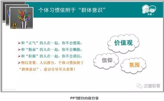 在企業(yè)中,管理的最高境界是自律,而自律就需要每個(gè)人改變自己,繼而形成高度統(tǒng)一的“群體意識(shí)”。因此,所有人的習(xí)慣都和企業(yè)有很大的關(guān)系,物以類聚、人以群分,個(gè)體習(xí)慣依附于“群體意識(shí)”,意識(shí)引導(dǎo)至關(guān)重要!