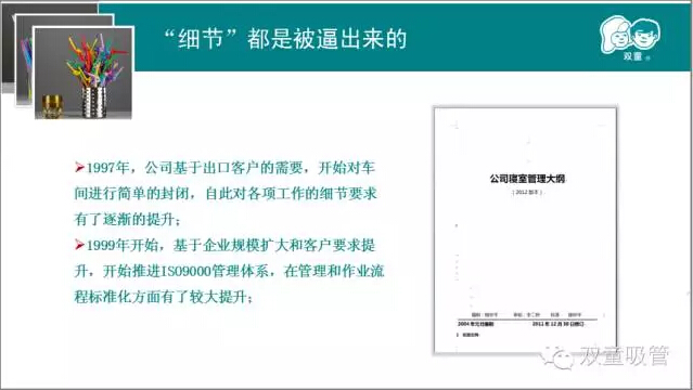 第二章,“雙童”樓仲平結(jié)合我們“雙童”自身的真實案例,來說明實施精細化管理對產(chǎn)品質(zhì)量的重要性!通過和日本客戶的合作,我們一次次地提升,一次次地逼著自己做更高的要求和改變,以此來達到客戶的需求,更通過這些舉措,慢慢地改變我們自己的產(chǎn)品質(zhì)量和員工素質(zhì)!