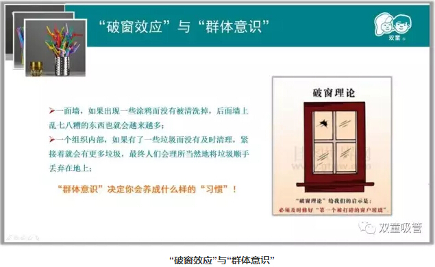 就好比剛來“雙童”的新員工,剛進廠門的時候會隨地吐痰??墒沁^了一段時間,看到大家都不會這么做,再加上在干凈整潔的環(huán)境下也不好意思再隨地吐痰。久而久之,自身的壞習(xí)慣也慢慢地消失,養(yǎng)成了好的行為習(xí)慣!