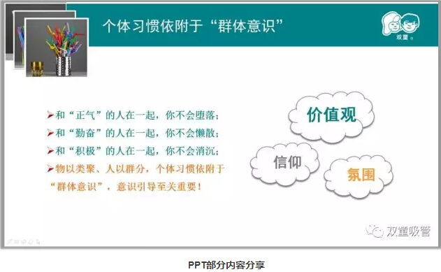 在企業(yè)中,管理的最高境界是自律,而自律就需要每個人改變自己,繼而形成高度統(tǒng)一的“群體意識”。因此,所有人的習(xí)慣都和企業(yè)有很大的關(guān)系,物以類聚、人以群分,個體習(xí)慣依附于“群體意識”,意識引導(dǎo)至關(guān)重要!