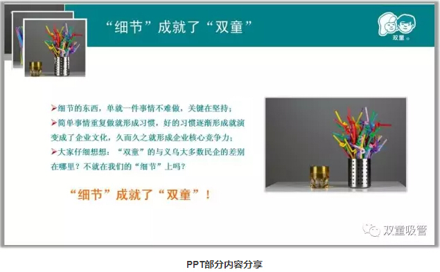 學(xué)習(xí)會進行到最后,“雙童”樓仲平說道:“其實形成好的習(xí)慣并不難,細節(jié)的東西,單就一件事情不難做,關(guān)鍵在堅持;簡單事情重復(fù)做就形成習(xí)慣,好的習(xí)慣逐漸形成就演變成了企業(yè)文化,久而久之就形成企業(yè)核心競爭力。其實是‘細節(jié)’成就了‘雙童’!”