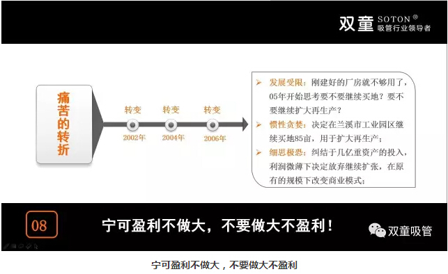 答:“‘雙童’在前十年不斷追求大,追求大客戶、大規(guī)模、大企業(yè)。在整個(gè)過程當(dāng)中,不僅產(chǎn)品的品質(zhì)越來越低,利潤(rùn)也越來越低。2005年,‘雙童’經(jīng)歷了痛苦的轉(zhuǎn)型,決定放棄繼續(xù)擴(kuò)張,在原有的規(guī)模下改變商業(yè)模式,寧可盈利不做大,不要做大不盈利。”