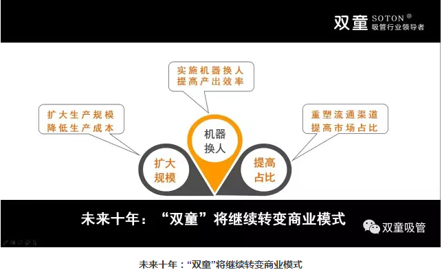 未來十年,“雙童”將繼續(xù)轉(zhuǎn)變商業(yè)模式,在規(guī)模上保持適量擴(kuò)張,實(shí)施機(jī)器換人提高產(chǎn)出效率,重塑流通渠道,提高市場(chǎng)占比!“適當(dāng)?shù)囊?guī)模”未必跟硬資產(chǎn)規(guī)模、產(chǎn)值、員工數(shù)成正比,不同行業(yè)對(duì)企業(yè)“適當(dāng)?shù)囊?guī)模”應(yīng)該有不同的認(rèn)知和判斷,根據(jù)企業(yè)經(jīng)營(yíng)“時(shí)間軸”變化做相應(yīng)調(diào)整來改變“雙童”未來在行業(yè)當(dāng)中的地位!