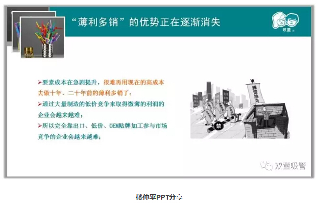 樓仲平也坦言:“雙童”前十年也追求全球最大,但是當時產(chǎn)生的瓶頸是無品牌、低品質、薄利多銷。但2003年之后,“雙童”基于當時企業(yè)界盲目的國際化浪潮,“雙童”選擇了國內與國外市場并舉,明確將市場開拓的中心轉移到國內市場,明確開始在國內市場投放廣告推廣,逐漸向品牌化、個性化、精細化轉變。