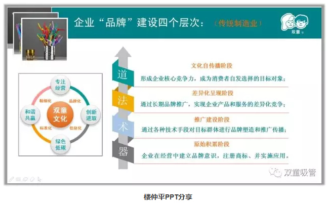 第三階段:差異化呈現(xiàn)階段。很多人會很好奇,“雙童”作為一家吸管制造企業(yè),為什么會吸引大量的社會和媒體關注呢?當家人樓總和大家坦白:其實,這就是我們一直以來塑造差異化亮點,并做到“人無我有,人有我先”,用“講故事”的形式把“雙童”品牌傳播到大江南北的結果!當然,這之前有一個前提:一定要先把企業(yè)做好!