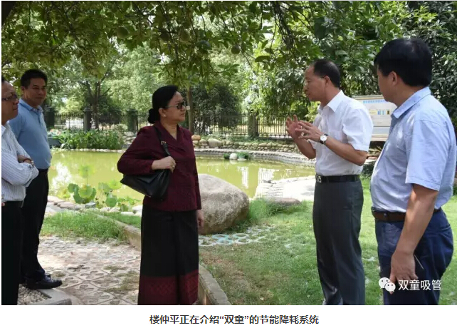 “雙童”樓仲平首先帶領(lǐng)部長(zhǎng)先生一行參觀了“雙童”的廢水收集處理循環(huán)回用系統(tǒng)。他介紹道:“別看這只是一口普通的景觀湖,其實(shí)它分為上下兩層,上層是一米多深的景觀養(yǎng)魚湖,下層是四米五深的中水儲(chǔ)存池,專門用于儲(chǔ)存廢水呢!我們廠區(qū)內(nèi)所有員工產(chǎn)生的生活廢水都會(huì)被過(guò)濾后匯集到儲(chǔ)存池,用于綠化噴淋、洗車清潔、馬桶沖水等,不花費(fèi)企業(yè)一分錢!”