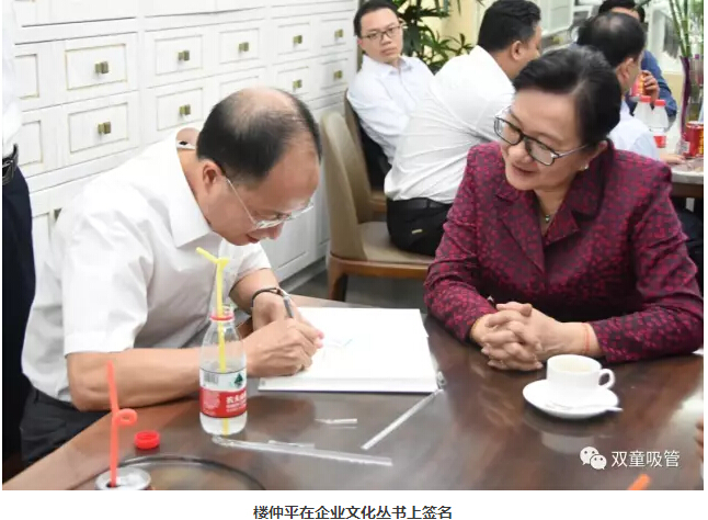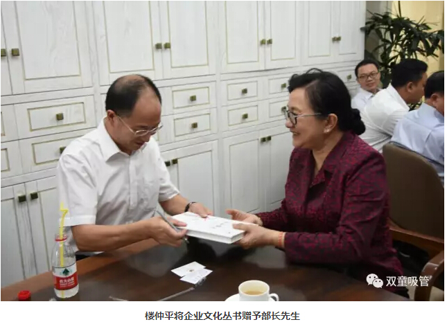 坐下后,看到桌子上的企業(yè)文化叢書,部長(zhǎng)先生忍不住翻閱起來(lái),并向樓仲平主動(dòng)表示:“我太喜歡你們公司的企業(yè)文化了,能送我一本嗎?”她說(shuō):“我真是太喜歡‘雙童’了!看到部長(zhǎng)先生對(duì)“雙童”文化如此感興趣,樓仲平非常希望能夠送她一套企業(yè)文化叢書。部長(zhǎng)先生說(shuō)道:“既然你把書贈(zèng)予我,當(dāng)然要幫我在上面簽名?!睒侵倨介_(kāi)玩笑道:“自己只上過(guò)小學(xué),不太會(huì)寫字,都是蓋章的?!辈块L(zhǎng)先生大方直言自己也才讀了六年的書,可見(jiàn)要取得如今的成就,部長(zhǎng)先生背后付出了多少努力呢!