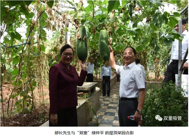 在交流過(guò)程中,有陪同領(lǐng)導(dǎo)談到了“雙童”的屋頂菜園,部長(zhǎng)先生一聽(tīng)也非常感興趣,雖然時(shí)間已經(jīng)超時(shí),但部長(zhǎng)先生表示想要去看看。原先,考慮到外部高溫天氣,樓仲平本沒(méi)有安排參觀屋頂菜園,既然部長(zhǎng)先生如此感興趣,“雙童”樓仲平也陪同部長(zhǎng)先生來(lái)到了九樓的屋頂菜園,門一打開(kāi),當(dāng)看到滿園的瓜果蔬菜時(shí),大家都興奮極了!看到碩大的冬瓜時(shí),部長(zhǎng)先生更是高興的不得了,還邀請(qǐng)樓仲平一起合影呢!她說(shuō)道:“我真是太喜歡‘雙童’了!
