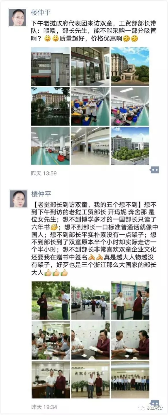 不知不覺(jué),部長(zhǎng)一行在“雙童”原本半個(gè)小時(shí)的走訪實(shí)際卻走訪了一個(gè)多小時(shí)。走訪期間,開(kāi)瑪妮·奔舍那部長(zhǎng)也不斷重復(fù)著“我真是太喜歡‘雙童’了”,并連續(xù)6次與樓總合影!臨走前,部長(zhǎng)先生也加了樓仲平的微信,并歡迎“雙童”去老撾?yún)⒂^考察,看看是否有機(jī)會(huì)在老撾投資。部長(zhǎng)先生說(shuō)道:“因?yàn)槲艺娴奶矚g‘雙童’了!”