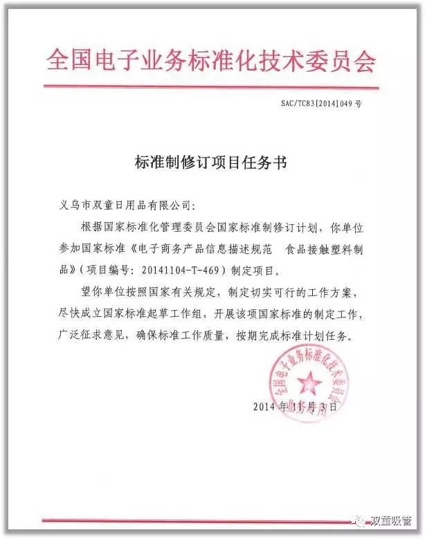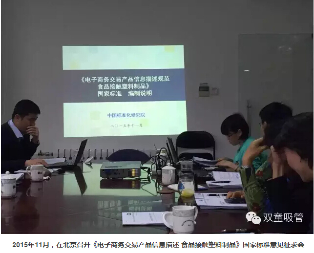 2014年11月3日,由“雙童”主導(dǎo)起草的《電子商務(wù)交易產(chǎn)品信息描述 食品接觸塑料制品》國家標(biāo)準(zhǔn)正式立項(xiàng),并于2016年3月于北京通過專家評(píng)審,2017年正式發(fā)布,標(biāo)準(zhǔn)號(hào)GB/T 33986-2017,該標(biāo)準(zhǔn)的發(fā)布實(shí)施,標(biāo)志著“雙童”在標(biāo)準(zhǔn)戰(zhàn)略工作中由起草單一的產(chǎn)品技術(shù)標(biāo)準(zhǔn)向系統(tǒng)的信息應(yīng)用標(biāo)準(zhǔn)轉(zhuǎn)變,為中小企業(yè)參加國家標(biāo)準(zhǔn)的起草工作樹立了一個(gè)新的方向。