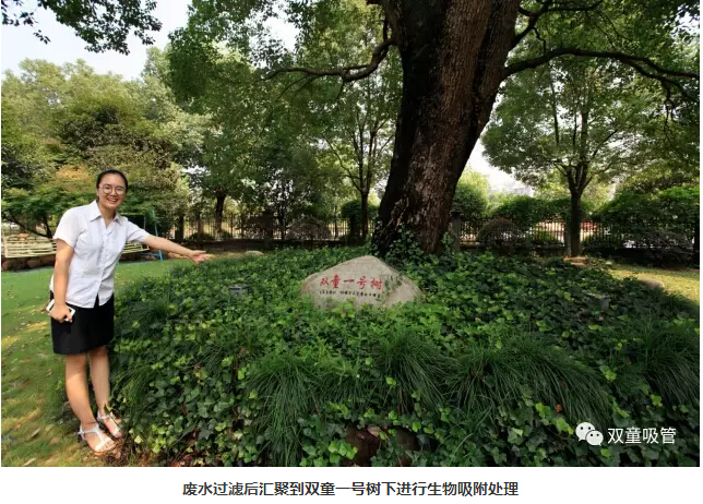 所謂“廢水收集處理循環(huán)回用系統(tǒng)”,其實(shí)就是將員工的生活廢水過(guò)濾后匯聚到“ 雙童一號(hào)樹(shù)”下進(jìn)行生物吸附處理,再流入中水儲(chǔ)存池,并為廠區(qū)所有衛(wèi)生間的馬桶沖水、綠化噴淋和道路清洗、車輛清洗所用,使公司的員工生活用水量節(jié)省了65%,每年為公司節(jié)省水費(fèi)支出40多萬(wàn)元!