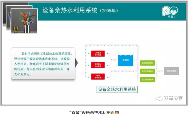 除此之外,“雙童”還設(shè)計(jì)了雨水收集系統(tǒng)、設(shè)備余熱水利用系統(tǒng)、設(shè)備余熱采集系統(tǒng)、垃圾分類等節(jié)能降耗設(shè)施,這些節(jié)能降耗設(shè)施不僅每年能為公司節(jié)省200多萬(wàn)元的費(fèi)用支出,而且讓“雙童”成為了綠色環(huán)保的生態(tài)花園式工廠!