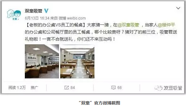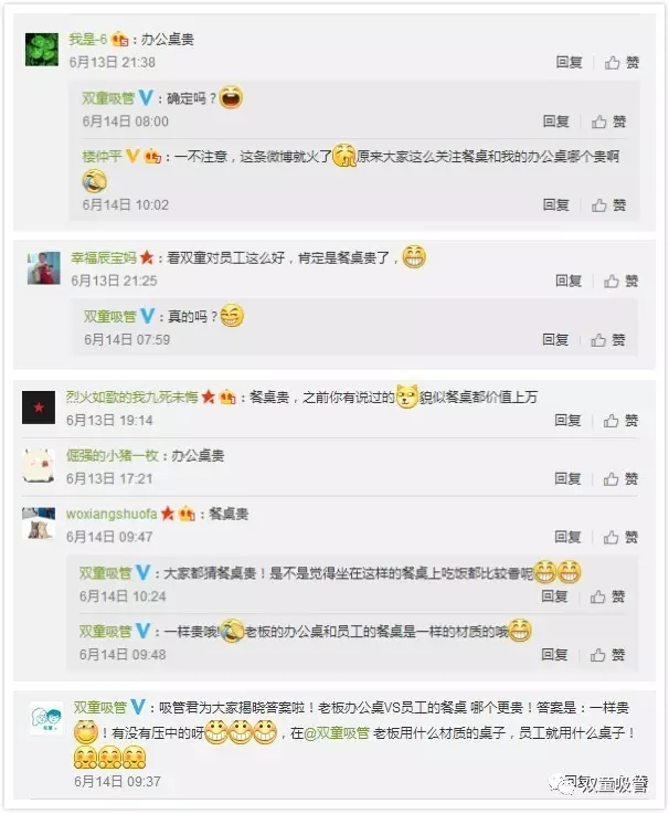 前段時(shí)間,“雙童”官方微博發(fā)布了一條關(guān)于老板辦公桌和員工餐桌對(duì)比的微博引起了網(wǎng)友的熱議,不少粉絲都很詫異員工的餐桌居然和老板的辦公桌一樣貴,為什么“雙童”要給員工用這么好的硬件?下面,吸管妞就開揭開這個(gè)秘密!