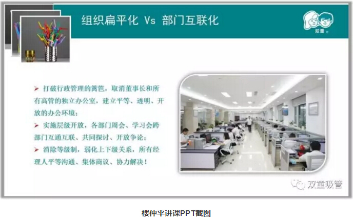 通過(guò)部門互聯(lián)化和組織扁平化,讓“雙童”實(shí)現(xiàn)了層級(jí)開放,讓各部門能夠跨部門互通互聯(lián),有效溝通,同時(shí),有效地弱化了上下級(jí)關(guān)系,促使所有員工平等溝通、集體商議、協(xié)力解決,促進(jìn)企業(yè)高效運(yùn)轉(zhuǎn)!親,你明白了嗎?