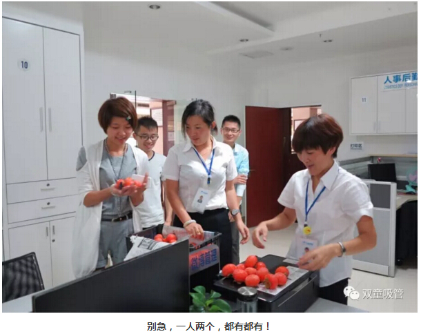 吸管妞忍不住嘗了嘗剛熟透的柿子,真是甜如蜜呀!啥都別說了,趕緊拿去食堂給所有員工分一分。一聽說有甜柿子可吃,這可樂壞了大伙,全都湊上來嘗嘗鮮!別急別急,一人兩個(gè),都能吃到!