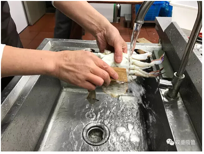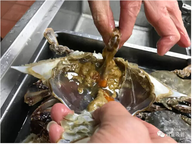 12、取出砂囊后將蟹身兩側(cè)的蟹鰓(看上去像魚(yú)鰓)用手工拔除干凈,如果蟹鰓底部有烏黑砂子,千萬(wàn)不要用清水沖洗,用干凈牙刷局部清洗一下就可以了。