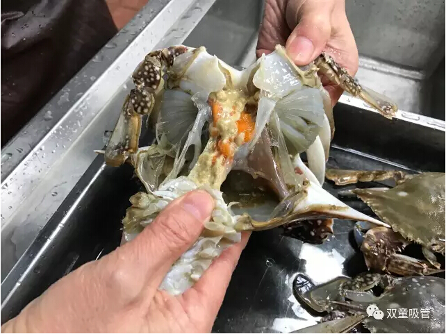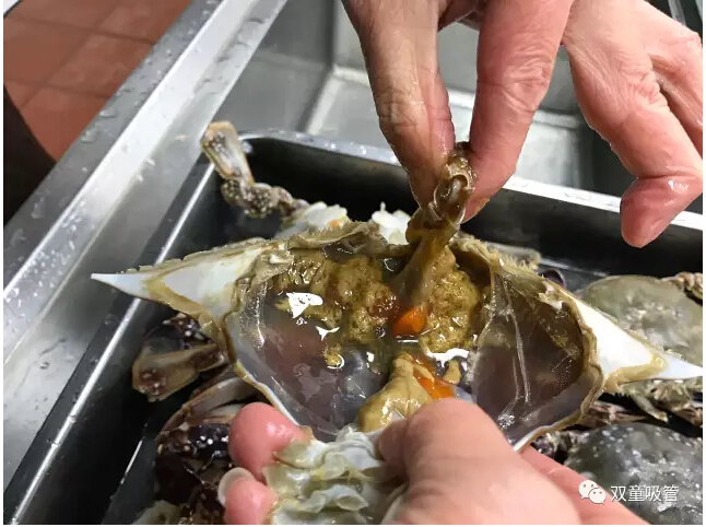 11、一般情況下砂囊會(huì)隨膏體粘在蟹殼的嘴部,也可能在隨膏體粘在蟹身嘴部,反正一定要找到取出!