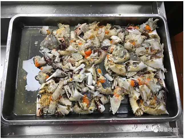 17、螃蟹清洗宰殺完畢準(zhǔn)備烹煮,宰殺后的螃蟹千萬(wàn)千萬(wàn)不能清洗了,連同黑乎乎湯汁(膏體)一并燒進(jìn)去。