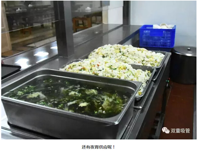 中餐和晚餐就更加豐盛啦,都是三菜一湯的標(biāo)準(zhǔn)。一葷兩素營養(yǎng)搭配,每天都不一樣哦!夜宵則有蛋炒飯、紫菜雞蛋湯、面條…… 晚上11點(diǎn)還有營養(yǎng)的夜宵供應(yīng),員工們進(jìn)了“雙童”可得胖三斤呀!