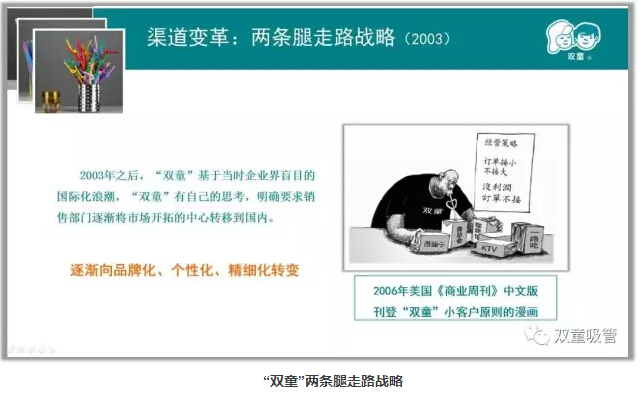在2003年以前,基于當(dāng)時(shí)中國(guó)企業(yè)界盲目的國(guó)際化浪潮,義烏的制造型企業(yè)幾乎都一窩蜂追求外貿(mào)出口,基本沒(méi)有自主品牌意識(shí)?!半p童”也是如此,企業(yè)外貿(mào)比重一度達(dá)到了百分之八九十,而外貿(mào)比重過(guò)大的風(fēng)險(xiǎn)也時(shí)刻警醒著樓仲平,他開(kāi)始反思原有的商業(yè)模式,認(rèn)為“雙童”不應(yīng)該放棄國(guó)內(nèi)市場(chǎng),不應(yīng)該滿足于薄利多銷(xiāo)的發(fā)展模式而應(yīng)尋求品牌和渠道轉(zhuǎn)型。于是,“雙童”逐漸放棄了原先低價(jià)貼牌加工的外貿(mào)“大客戶”,并基于“雙童”品牌的塑造,提出了“兩條腿走路”戰(zhàn)略:公司明確要求銷(xiāo)售部門(mén)逐漸將主力市場(chǎng)轉(zhuǎn)移到國(guó)內(nèi)市場(chǎng),小部分轉(zhuǎn)移到日本和歐洲市場(chǎng),向品牌化、個(gè)性化、精細(xì)化轉(zhuǎn)變。